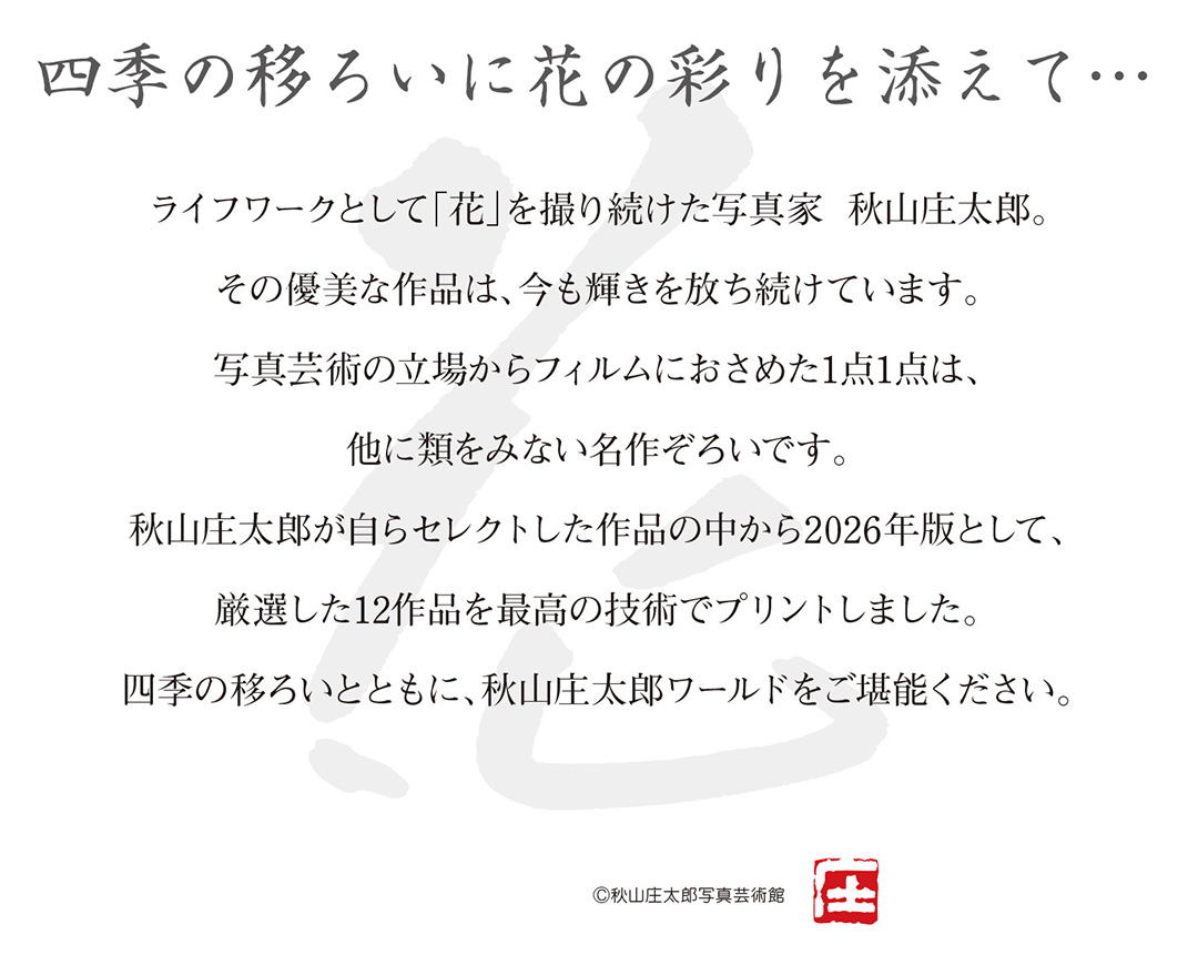 | 【カレンダーの2026年版リニューアルについて】 これまで、本カレンダーはフィルム印刷で仕上げてまいりましたが、近年の環境配慮への意識の高まりや、製造原価・諸物価高騰等の現状を受けて、素材や製作工程の見直しをデザイン・印刷・販売部署と行い、2026年版より、光沢ある高品質の紙に変更することといたしました。昨年同様の価格でご提供いたします。 今後も、秋山庄太郎撮影の「花」ワールドをご堪能いただけると存じます。尚、フレームは従来通りで、名入れ加工も対応いたします。 皆様のお部屋やデスクを華やかに彩り、新しい一年を飾るにふさわしい“秋山庄太郎『花』カレンダー”のお申込みを心よりお待ちしております。 【本体価格】1,800円(税込1,980円・送料別) ※1部からご購入いただけます。 ※限定品につき、売り切れ次第販売終了とさせていただきます。 【商品について】 ●以下の2種類のフレームからお選びいただけます。 @「無記名」 A「秋山庄太郎写真芸術館オリジナル版(サイン+落款)」 B「ご指定名入れ」※受付は2026年10月30日(木・必着)まで。原則として30部より承ります。初回のみ名入れ製作費(3,000円(税別)より)が必要です。 その他、カレンダーの詳細は下記のPDFからご覧いただけます。 2026年花カレンダーカタログ(PDF) 【お申込み方法】 @「無記名」もしくはA「秋山庄太郎写真芸術館オリジナル版」をご希望の場合 必要事項を記入した申込書(PDF)、もしくは下記の事項を記入したお手紙(ハガキ可)、FAX、メールを〈お申込み先〉にお送りください。 2026年花カレンダー申込書(PDF) 件名 花カレンダー2026購入希望 本文 (1)お名前(フリガナ) (2)商品お届け先ご住所(郵便番号、都道府県名、マンション・ビル名もご記入ください) (3)お電話番号(ご自宅・携帯電話等、日中ご連絡のとれる番号) (4)購入ご希望数 (5)フレームの名入れ「無記名」か「秋山庄太郎写真芸術館オリジナル版」をお選びください。 B「ご指定名入れ」の場合 申込書に必要事項をご記入の上、メールもしくはファックスにて〈お申込み先〉にお送りください。 〈お申込み先〉 住所:107-0062 東京都港区南青山4-18-9 秋山庄太郎写真芸術館 FAX番号:03-3403-8865 メールアドレス: ●お支払い:商品到着後、銀行振込または郵便振替でお願いします(手数料はご負担ください)。送料込みのお支払い額は納品時にお知らせします。 ●送付方法:部数により下記のようにお送りします。 1部=レターパックライト(送料430円) 2部=レターパックプラス(送料600円) 3部以上=ヤマト運輸宅急便(料金は商品送付時にお知らせします) 20部以上=送料無料 ●納品:秋山庄太郎写真芸術館または製作部署より、11月上旬から12月上旬頃発送予定です。 *限定品につき、原則として返品対応はできません。万一、配送途中の事故による汚損・破損がありましたら、商品到着後7日以内にご連絡ください。送料当方負担で交換対応いたします。 ※ご不明の点は下記にお問合せください。 電話=03-3405-8578 秋山庄太郎写真芸術館 《対応時間》 11:00〜16:00 水・木・金(11月26日(水)、年末年始を除く) その他の日時は館業務の都合によりお受けできません。 ※お客様の個人情報は、本商品のご購入手続・発送および今後の商品のご案内にのみ使用します。 |