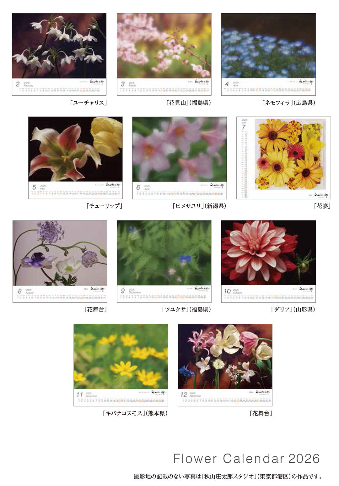 | 【カレンダーの2026年版リニューアルについて】 これまで、本カレンダーはフィルム印刷で仕上げてまいりましたが、近年の環境配慮への意識の高まりや、製造原価・諸物価高騰等の現状を受けて、素材や製作工程の見直しをデザイン・印刷・販売部署と行い、2026年版より、光沢ある高品質の紙に変更することといたしました。昨年同様の価格でご提供いたします。 今後も、秋山庄太郎撮影の「花」ワールドをご堪能いただけると存じます。尚、フレームは従来通りで、名入れ加工も対応いたします。 皆様のお部屋やデスクを華やかに彩り、新しい一年を飾るにふさわしい“秋山庄太郎『花』カレンダー”のお申込みを心よりお待ちしております。 【本体価格】1,800円(税込1,980円・送料別) ※1部からご購入いただけます。 ※限定品につき、売り切れ次第販売終了とさせていただきます。 【商品について】 ●以下の2種類のフレームからお選びいただけます。 @「無記名」 A「秋山庄太郎写真芸術館オリジナル版(サイン+落款)」 B「ご指定名入れ」※受付は2026年10月30日(木・必着)まで。原則として30部より承ります。初回のみ名入れ製作費(3,000円(税別)より)が必要です。 その他、カレンダーの詳細は下記のPDFからご覧いただけます。 2026年花カレンダーカタログ(PDF) 【お申込み方法】 @「無記名」もしくはA「秋山庄太郎写真芸術館オリジナル版」をご希望の場合 必要事項を記入した申込書(PDF)、もしくは下記の事項を記入したお手紙(ハガキ可)、FAX、メールを〈お申込み先〉にお送りください。 2026年花カレンダー申込書(PDF) 件名 花カレンダー2026購入希望 本文 (1)お名前(フリガナ) (2)商品お届け先ご住所(郵便番号、都道府県名、マンション・ビル名もご記入ください) (3)お電話番号(ご自宅・携帯電話等、日中ご連絡のとれる番号) (4)購入ご希望数 (5)フレームの名入れ「無記名」か「秋山庄太郎写真芸術館オリジナル版」をお選びください。 B「ご指定名入れ」の場合 申込書に必要事項をご記入の上、メールもしくはファックスにて〈お申込み先〉にお送りください。 〈お申込み先〉 住所:107-0062 東京都港区南青山4-18-9 秋山庄太郎写真芸術館 FAX番号:03-3403-8865 メールアドレス: ●お支払い:商品到着後、銀行振込または郵便振替でお願いします(手数料はご負担ください)。送料込みのお支払い額は納品時にお知らせします。 ●送付方法:部数により下記のようにお送りします。 1部=レターパックライト(送料430円) 2部=レターパックプラス(送料600円) 3部以上=ヤマト運輸宅急便(料金は商品送付時にお知らせします) 20部以上=送料無料 ●納品:秋山庄太郎写真芸術館または製作部署より、11月上旬から12月上旬頃発送予定です。 *限定品につき、原則として返品対応はできません。万一、配送途中の事故による汚損・破損がありましたら、商品到着後7日以内にご連絡ください。送料当方負担で交換対応いたします。 ※ご不明の点は下記にお問合せください。 電話=03-3405-8578 秋山庄太郎写真芸術館 《対応時間》 11:00〜16:00 水・木・金(11月26日(水)、年末年始を除く) その他の日時は館業務の都合によりお受けできません。 ※お客様の個人情報は、本商品のご購入手続・発送および今後の商品のご案内にのみ使用します。 |